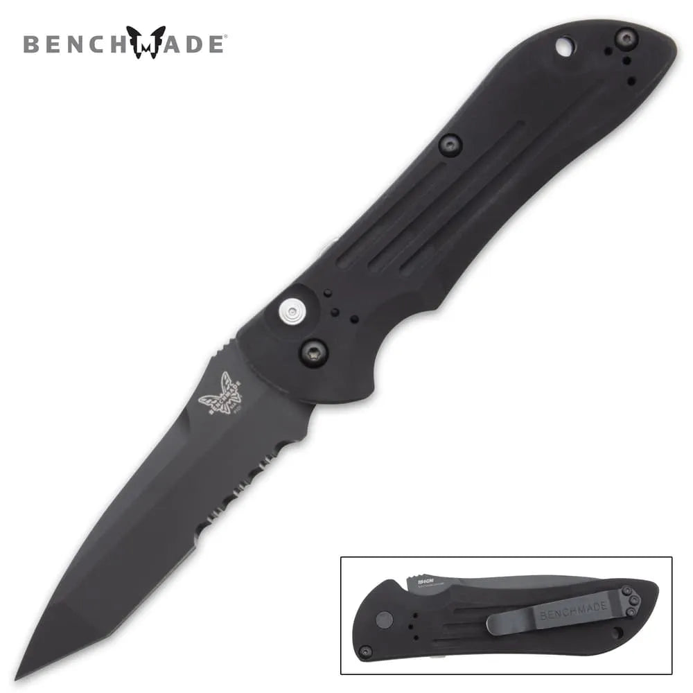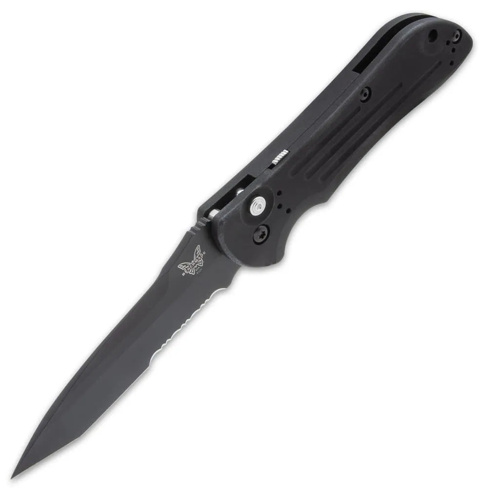 The Benchmade Auto Stryker automatic knife features a premium 3 3/5-inch 154CM stainless steel tanto blade with durable black coating and partial serrations for versatile cutting tasks. The automatic push-button mechanism ensures swift, controlled deployment, while the lightweight 6061-T6 aluminum handle with open back spacer provides exceptional strength, comfortable grip, and easy maintenance access. Measuring 8 3/10 inches overall, it strikes the ideal balance of reach and portability. The deep-carry pocket clip and lanyard hole offer versatile, secure carry options.
