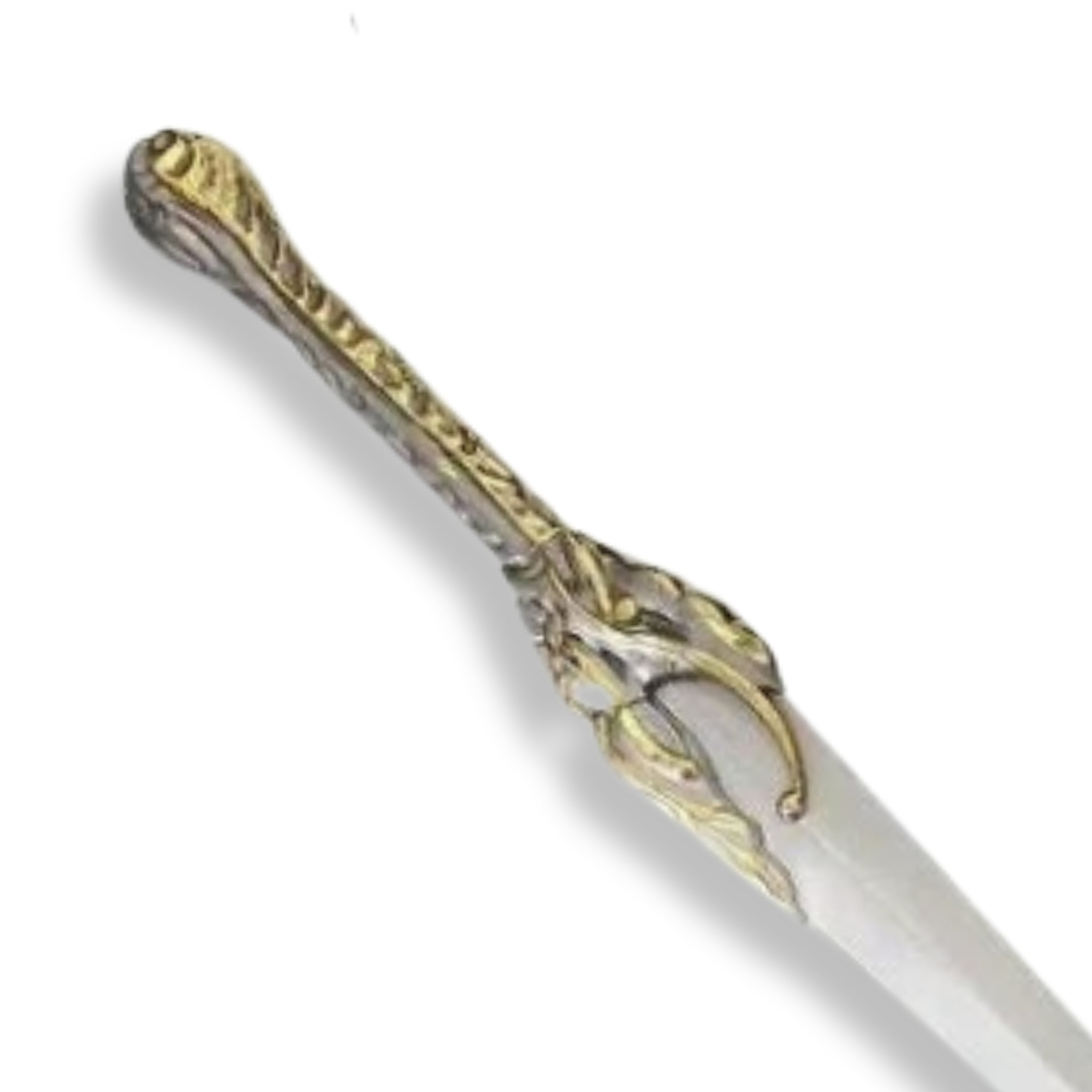 Concealed yet ever-ready, Galadriel’s dagger mirrors her unyielding spirit. The slender, leaf-shaped blade shines in mirror-polished stainless steel, etched with delicate silver vines and faint Tengwar verses. The hilt curves gently, wrapped in soft ivory leather, guarded by interlaced silver branches, and crowned with a pale moonstone pommel—a shard of captured starlight.