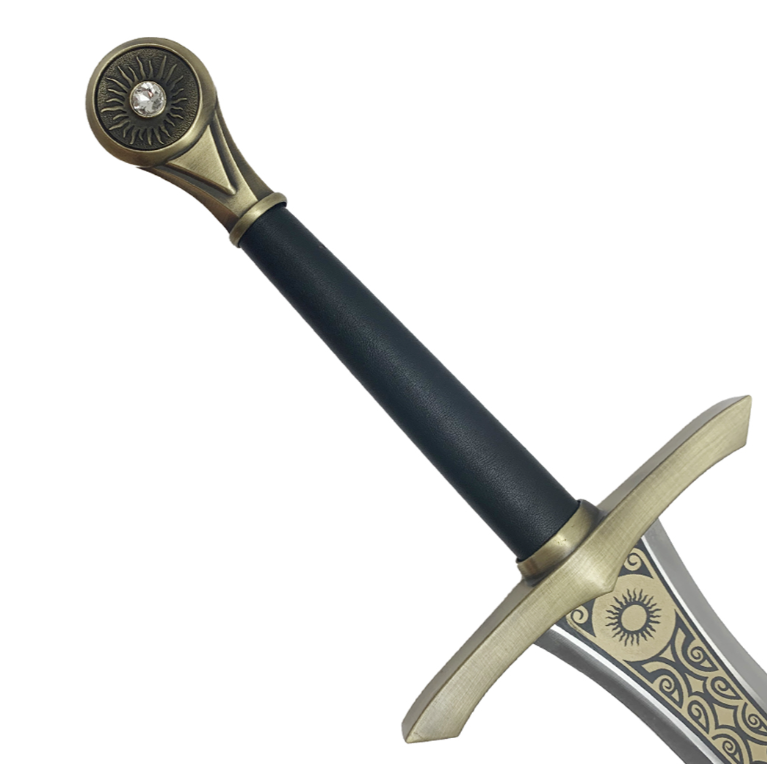 Wielded by Elendil during the War of the Last Alliance, this iconic sword symbolizes unbreakable resolve against Sauron’s darkness. Its sweeping broad blade, adorned with gold-etched Elvish runes, flows into an intricately cast crossguard and a jeweled pommel glowing with royal authority. Wrapped in genuine black leather with silver wire accents, the hilt offers both beauty and balance – ideal for display or cosplay.